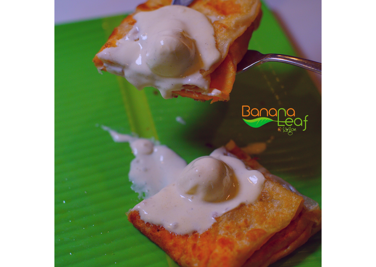 Roti Fujiyama is served by placing some sliced banana in between folds, topped with two generous scoops of ice cream. Roti Fujiyama featured with 2 scoops of refreshing ice cream on top, in between the layers of cake with thin banana slices.